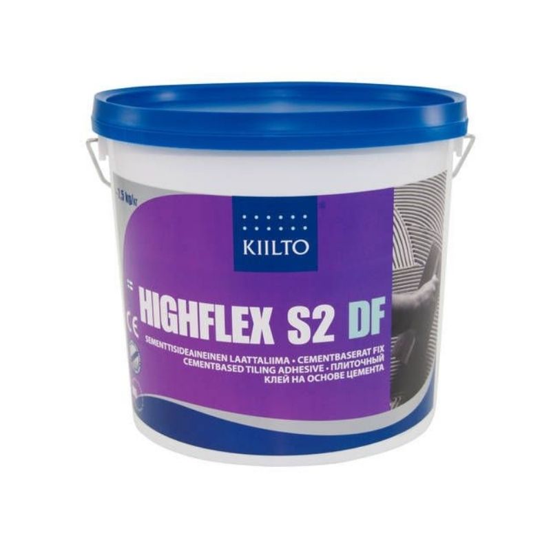 Kiilto Highflex S2 DF on valkoinen, valumaton, erittäin riittoisa ja hyvin muodonmuutoskykyinen kevyttäytteinen sementtipohjainen laattaliima keraamisten laattojen, lasimosaiikin sekä marmorin ja kivien kiinnitykseen.