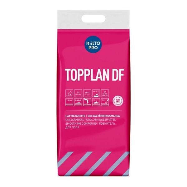 • Sementtiperustainen itsetasoittuva Kiilto TopPlan DF soveltuu 1-10 mm tasoituksiin, pienialaisissa tasoituksissa aina 20 mm:iin asti.