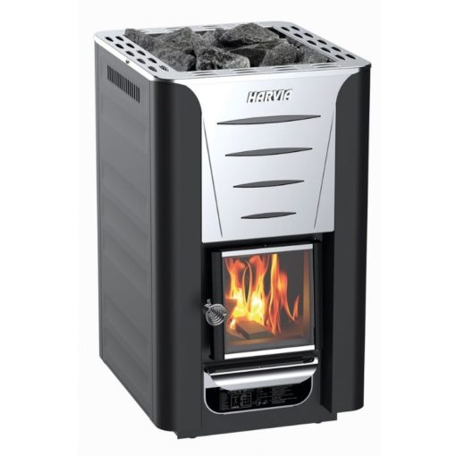 - Valurautaisen lasiluukun läpi loimuava tuli luo saunaan tunnelmaa ja suuri kivitila takaa nautinnolliset löylyt.