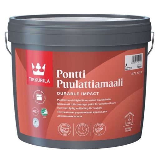 - Pontti puulattiamaali on hyvin peittävä ja täyttävä maali, joka tasoittuu kauniisti puulattioille ja -portaille.