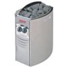 Kiukaassa kiinteä ohjauskeskus, jonka kytkimet sijaitsevat alhaalla kiukaan etupuolella.