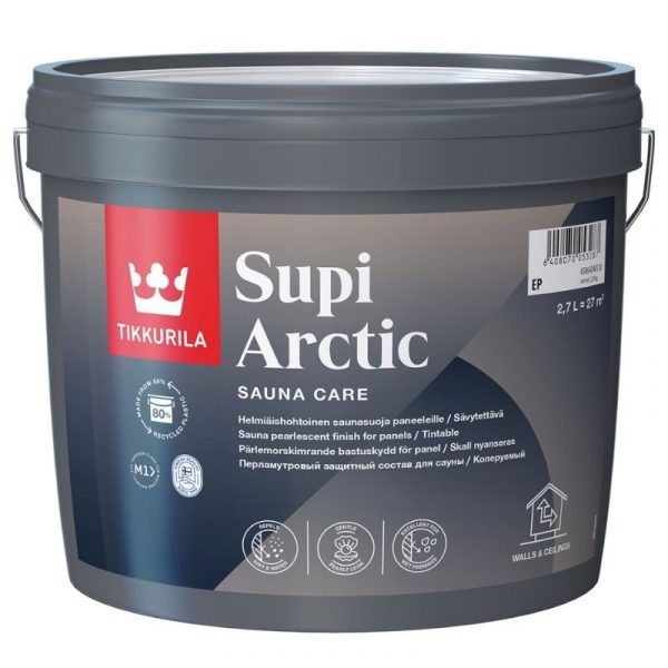 Supi Arctic – helmiäishohdetta saunatiloihin! Kosteiden tilojen puupinnoille. Muodostaa saunatilojen seiniin ja kattoihin likaa ja vettä hylkivän, ylellisen ja hennosti kimaltelevan pinnan. Riittoisuus 8 – 12 m²/litra.