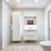 Valkoinen 8 mm paksu seinälaatta esimerkiksi pesuhuoneeseen tai pukuhuoneen seinälaataksi, laatta sopii kosteisiin tiloihin.