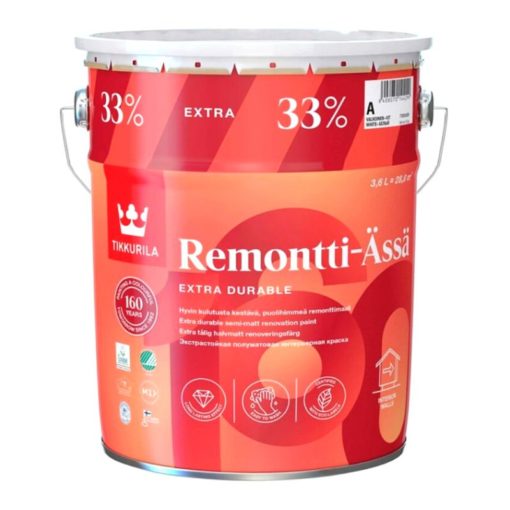 Tikkurila 160 vuotta. Sen kunniaksi saat Suomen suosituinta remonttimaalia juhlapurkissa, jossa on 33 % enemmän maalia. Remontti-Ässä on liuotteeton, pesunkestävä, puolihimmeä sisämaali.