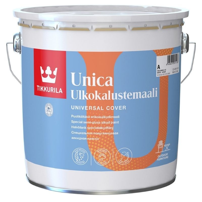 Puolikiiltävä alkydimaali puu- ja metallikalusteiden maalaamiseen sisällä ja ulkona. Riittoisuus 10 – 12 m²/litra sileille puu- ja 12 – 14 m²/litra metalli- ja muovipinnoille.